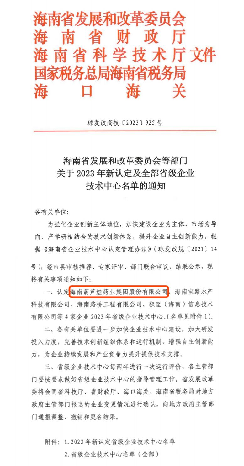 近日,海南省发改委等多部门联合公布了《关于2023年新认定及全部省级企业技术中心名单的通知》,其中,海南3003新葡的京药业集团股份有限公司成功通过评审,被认定为省级企业技术中心,是本次获批的4家企业之一。